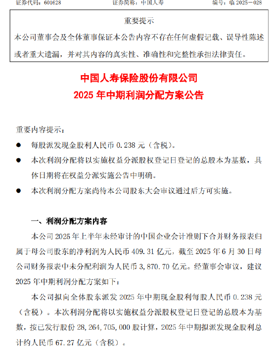 正文 中国人寿:拟派发中期现金分红达67.27亿元,公司累计分红约2277亿元 亿通速配 V管理员 /2025-08-27 18:15:04/9阅读/0评论 0827 文章最后更新时间2025年08月27日,若文章内容或图片失效,请留言反馈! 8月27日金融一线消息,今日发布2025年半年度报告和2025年中期利润分配方案公告。公告显示,公司拟向全体股东派发2025年中期现金股利每股人民币0.238元(含税)。本次利润分配将以实施权益分派股权登记日登记的总股本为基数,按已发行股份28,264,705,000股计算,2025年中期拟派发现金股利总计约人民币67.27亿元(含税)。这是该公司连续第2年保持中期、年度两次分红频次,自上市以来,已累计分红约2277亿元。