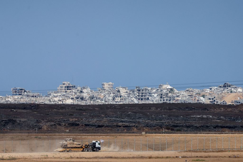 当地时间2025年10月9日,以色列-加沙边境,一辆以色列军用装甲车被卡车运送。视觉中国 图