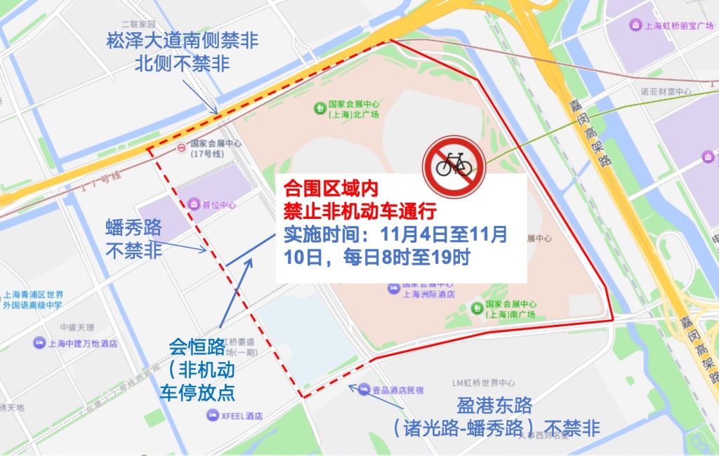 (五)11月4日至11月10日,每日8时至19时,在崧泽大道-蟠秀路-盈港东路-涞港路合围区域[除蟠秀路、崧泽大道北侧、盈港东路(诸光路-蟠秀路)外,含上述道路],禁止非机动车通行。