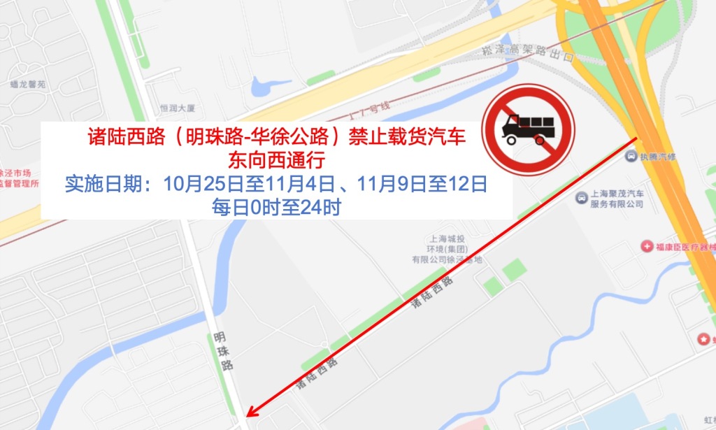 (一)10月25日至11月4日和11月9日至11月12日,每日0时至24时,诸陆西路(明珠路-华徐公路)东向西禁止载货汽车通行。