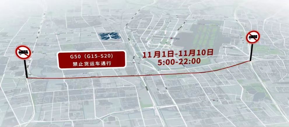 (二)11月1日至11月10日,每日5时至22时,G50沪渝高速(G15沈海高速-S20外环高速)双向禁止载货汽车通行。