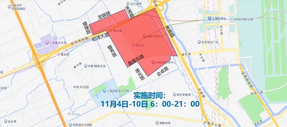 (三)11月4日至11月10日,每日6时至21时,沪青平公路-华徐公路-天山西路-华翔路合围区域(不含上述道路),禁止载货汽车和摩托车通行。