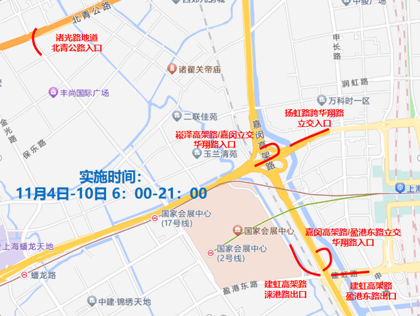 (四)11月4日至11月10日,每日6时至21时,在会卓路-诸光路-盈港东路-蟠秀路-崧泽大道-蟠臻路-龙联路-涞清路-崧泽大道-涞港路合围区域(除蟠秀路、蟠臻路、龙联路外,含上述道路),以及嘉闵高架路/盈港东路立交华翔路入口、建虹高架路盈港东路出口、建虹高架路涞港路出口、扬虹路跨华翔路立交入口、崧泽高架路/嘉闵立交华翔路入口以及诸光路地道北青公路入口,除下列车辆外,禁止其他机动车通行:执行公务的警车、消防车、救护车、工程抢险车;公交运营线路车辆;出租车;持有公安机关核发的各类进博会车辆证件和《控制区预约停车证》的车辆。