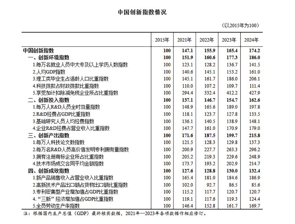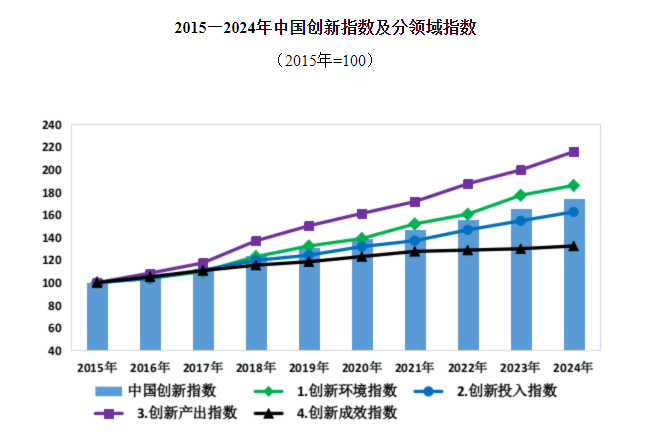 根据国家统计局社科文司《中国创新指数研究》课题组测算,2024年中国创新指数为174.2(以2015年为100),比上年增长5.3%[1]。分领域看,创新环境指数、创新投入指数、创新产出指数和创新成效指数分别为186.0、162.6、215.8和132.4,分别比上年增长4.9%、5.1%、8.1%和1.9%。结果表明,2024年中国创新指数保持稳步增长,我国科技创新能力持续提升,创新产出较快增长,发展新动能不断壮大,为经济高质量发展提供有力支撑。
